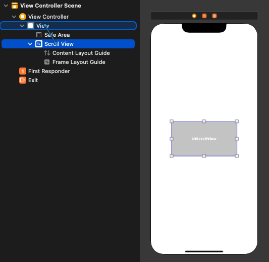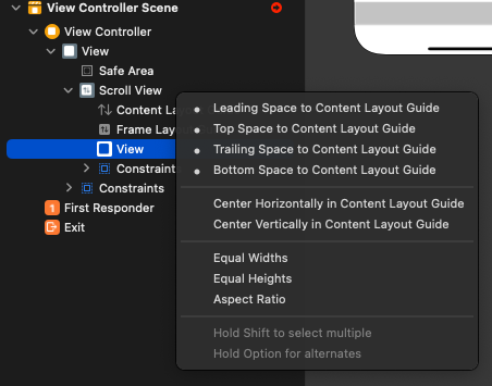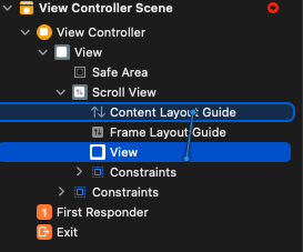 3. Scroll View 안에 View 추가 , View -> Content Layout Guide 네 방향 제약 추가(모두 0으로)